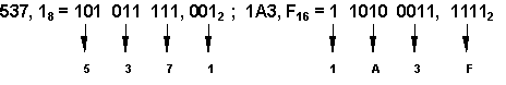 Числа в этих системах читаются почти так же легко, как десятичные, требуют соответственно в три (восьмеричная) и в четыре (шестнадцатеричная) раза меньше разрядов, чем в двоичной системе (ведь числа 8 и 16 – соответственно, третья и четвертая степени числа 2).