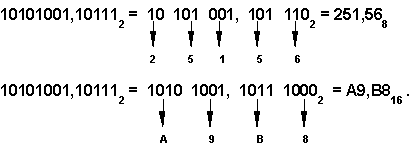 влево и вправо от запятой на триады (для восьмеричной) или тетрады