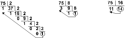 Пример: Перевести число 75 из десятичной системы в двоичную, восьмеричную и шестнадцатеричную: