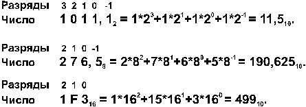 В позиционных системах счисления вес каждой цифры изменяется в зависимости от ее положения (позиции) в последовательности цифр, изображающих число. Например, в числе 757,7 первая семерка означает 7 сотен, вторая – 7 единиц, а третья – 7 десятых долей единицы.