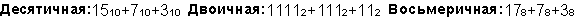 Ответ: 5+7+3 = 2510 = 110012 = 318 = 1916. Проверка: