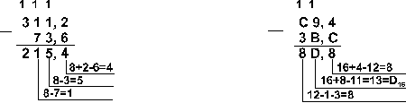 Рассмотрим основные арифметические операции: сложение, вычитание, умножение и деление. Правила выполнения этих операций в десятичной системе хорошо известны — это сложение, вычитание, умножение столбиком и деление углом. Эти правила применимы и ко всем другим позиционным системам счисления. Только таблицами сложения и умножения надо пользоваться особыми для каждой системы.